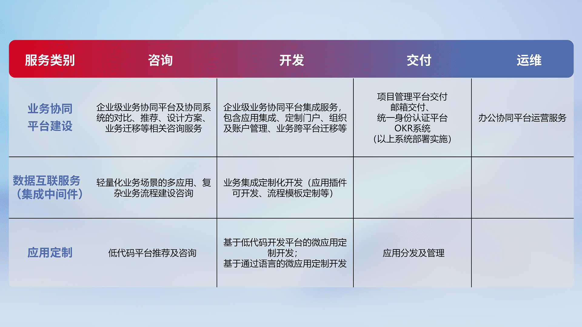 针对钉钉、、企微、、、、IDaas等平台级产品提供产品的规划、、、方案、、交付、、定制化开发等服务,,,实现如统一协同办公、、、、智能客户服务、、、、混合会议管理、、、、智能数据查询、、等业务场景,,,实现数字化转型。。。。